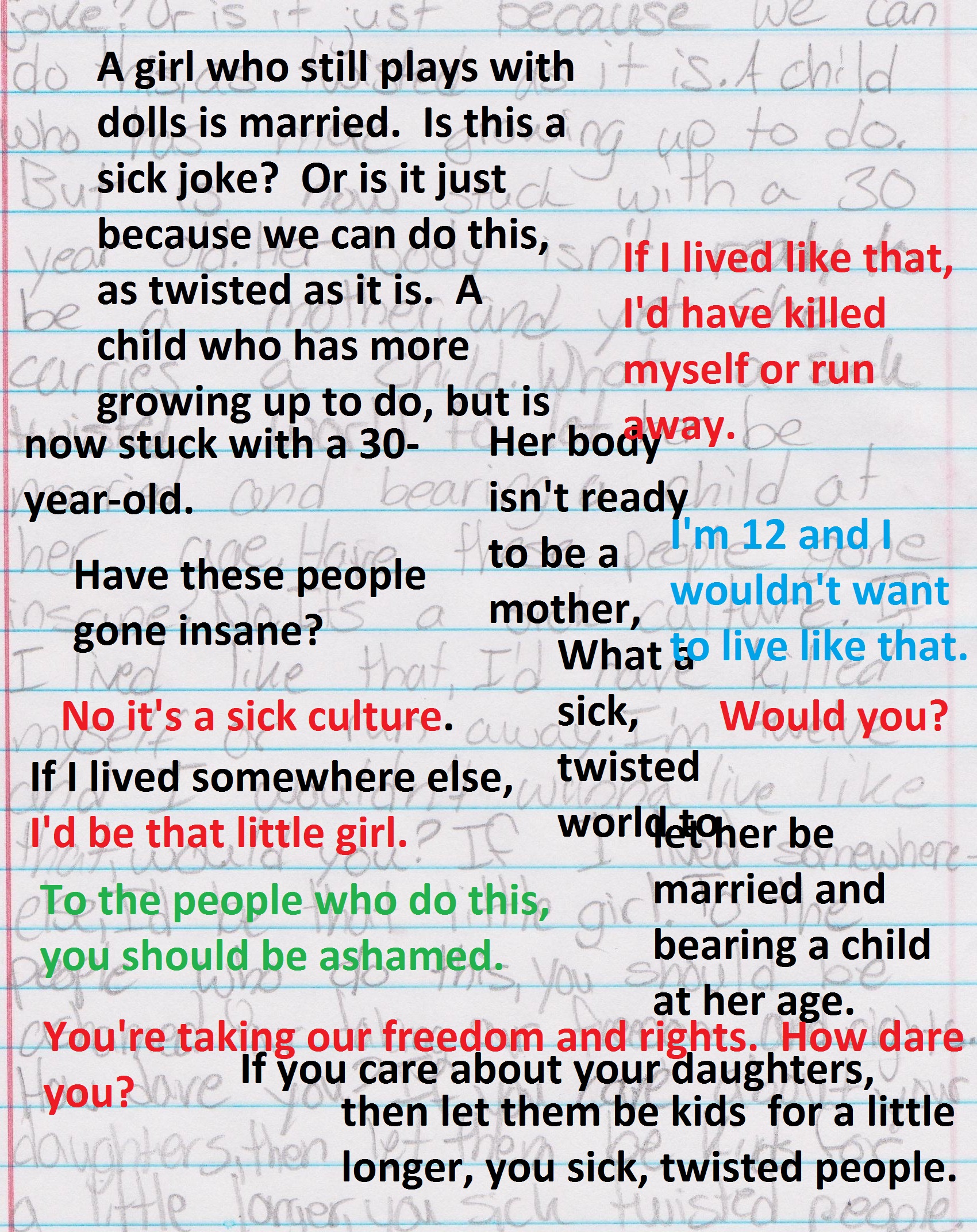 We are messed up eh!? One half of the world is hysterical about child protection, the other insists a girl is already a woman. Some middle ground please, World!!